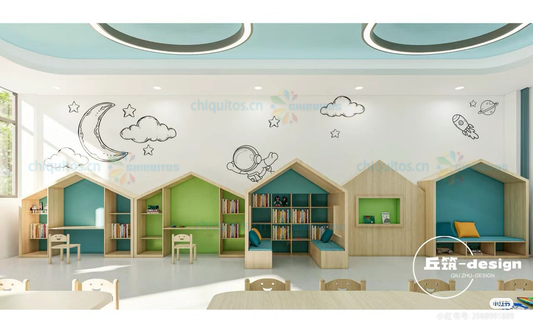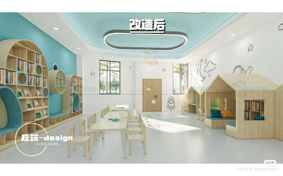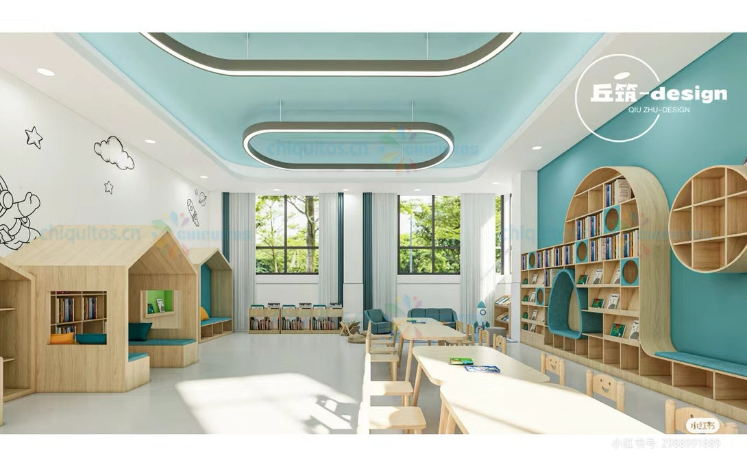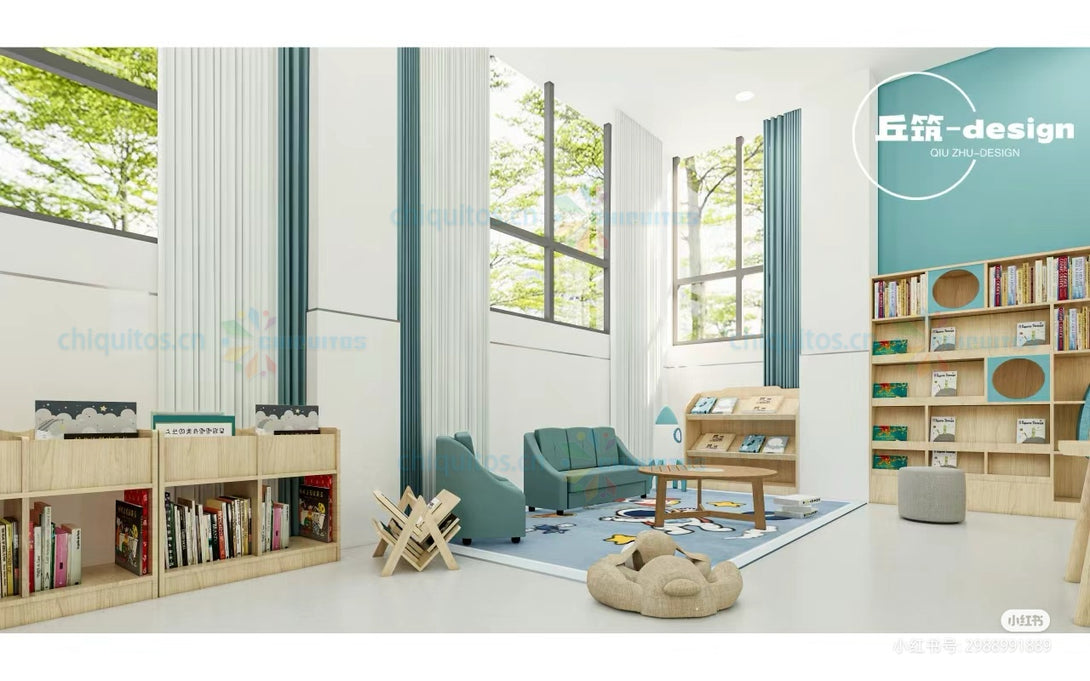 Chiquitos Children’s Reading Corner Furniture Set - Modern Wooden Bookshelf and Table Set for Kindergarten or Library, Space-Saving Book Display with Cute Chairs