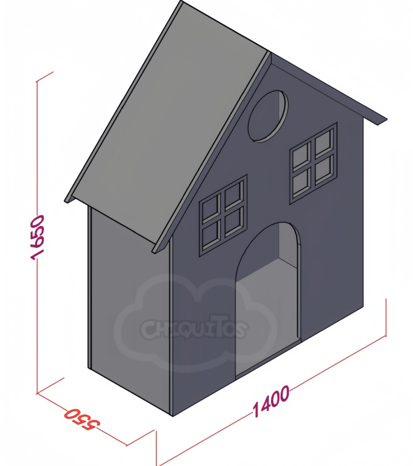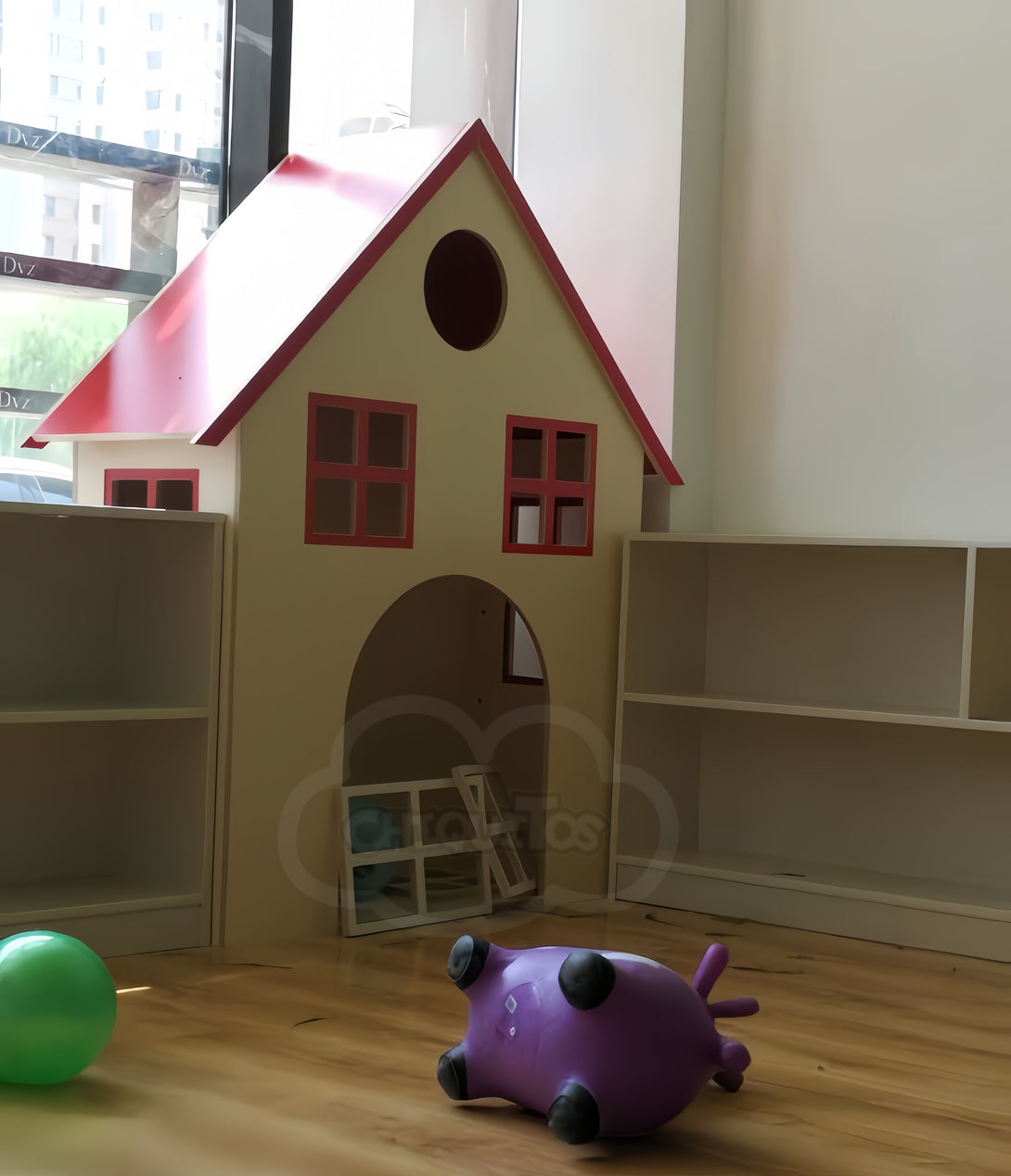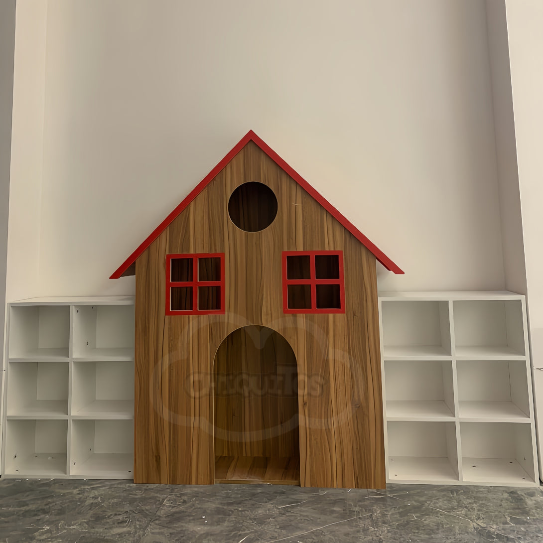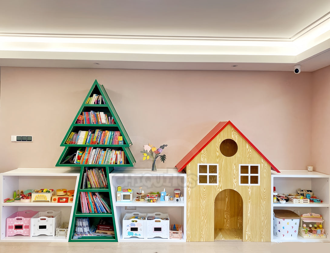 Chiquitos Children's Wood Bedroom House Shape Bookshelf Book Toy Storage Organizer with Dollhouse Cabinet for Kids Reading Room