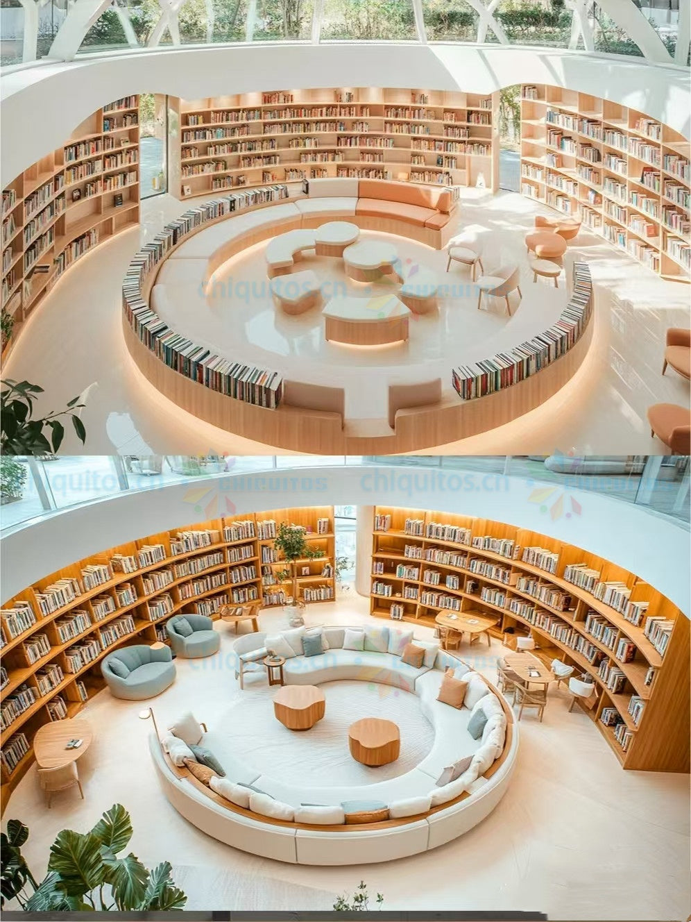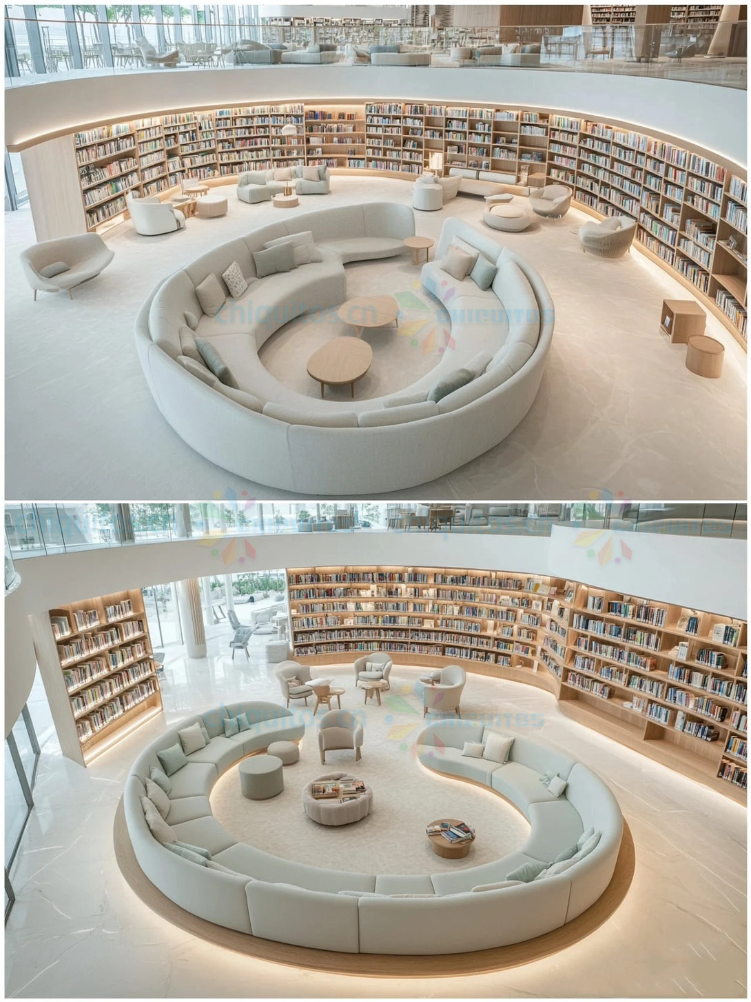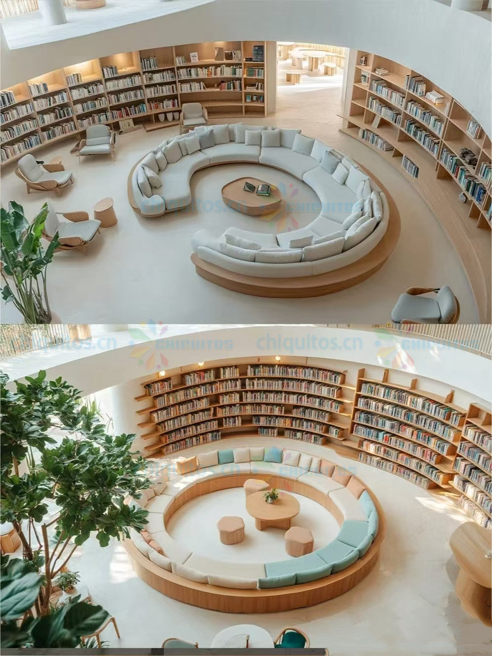 Chiquitos Modern Library Furniture Set - Circular Lounge Seating with Wooden Bookshelves and Tables, Comfortable Sofa Set for Reading Corners and Public Spaces