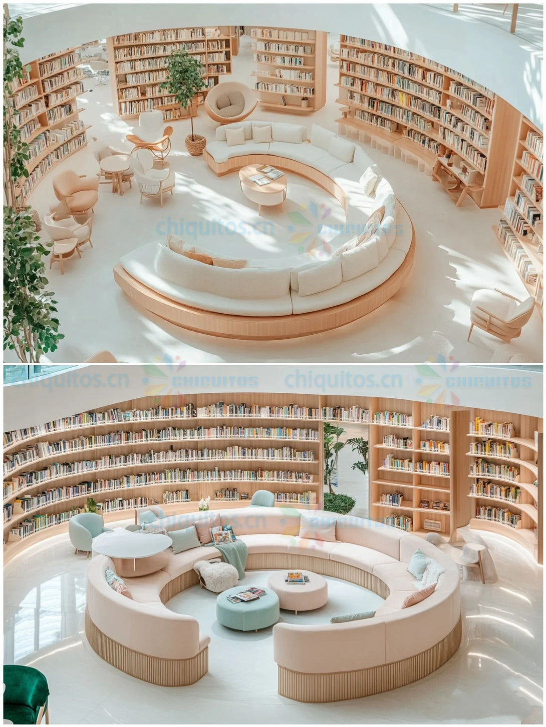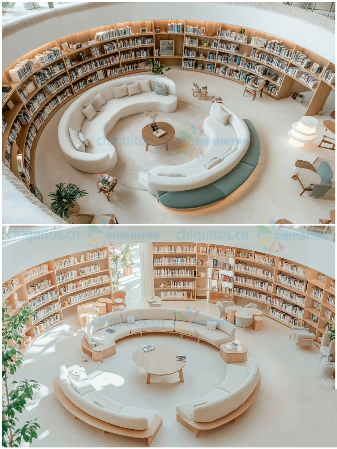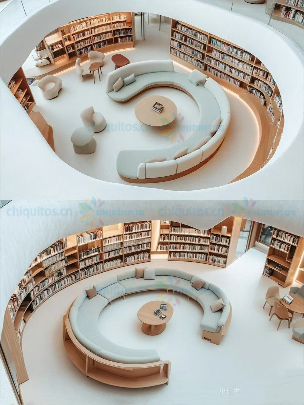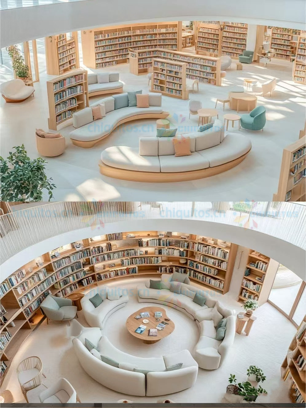 Chiquitos Modern Library Furniture Set - Circular Lounge Seating with Wooden Bookshelves and Tables, Comfortable Sofa Set for Reading Corners and Public Spaces