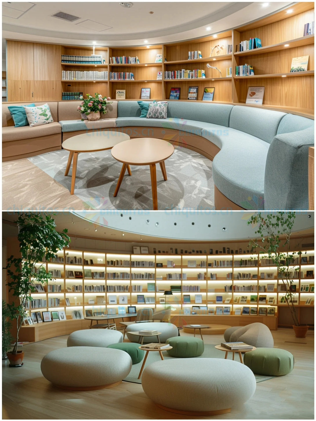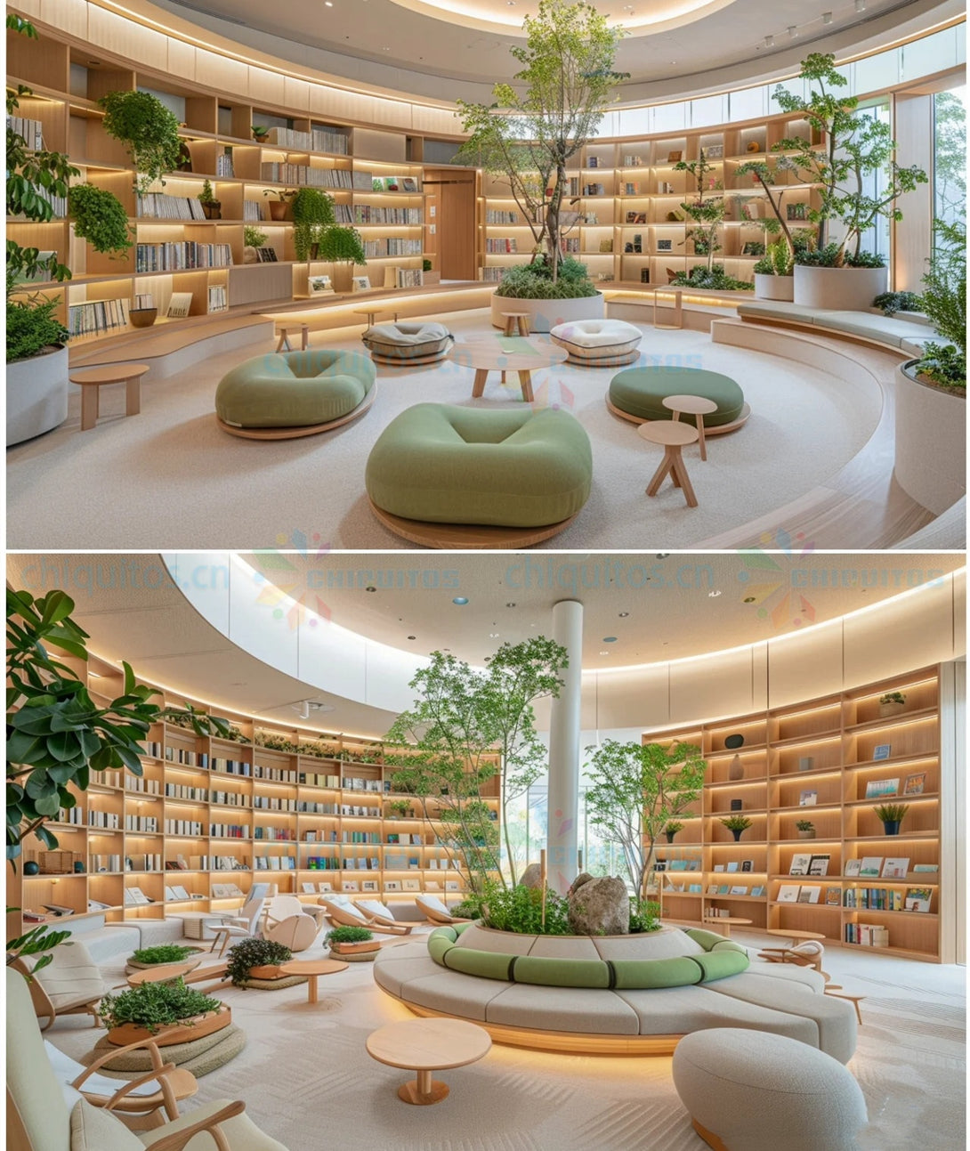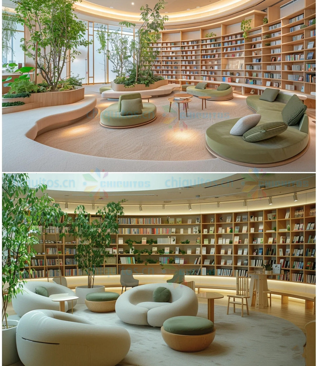 Chiquitos Modern Minimalist Wood Bookshelf Lounge Furniture Set for Reading Room Library Public Space Green Design with Comfortable Chairs