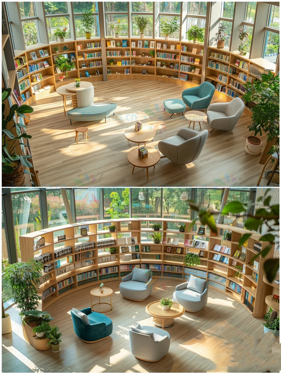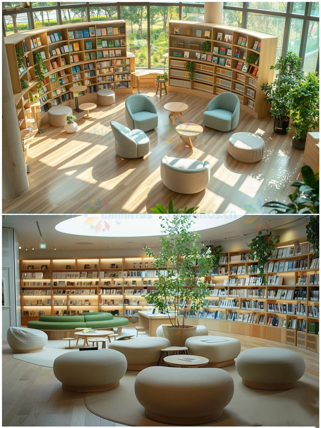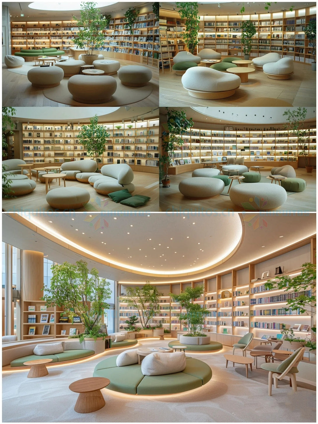Chiquitos Modern Minimalist Wood Bookshelf Lounge Furniture Set for Reading Room Library Public Space Green Design with Comfortable Chairs